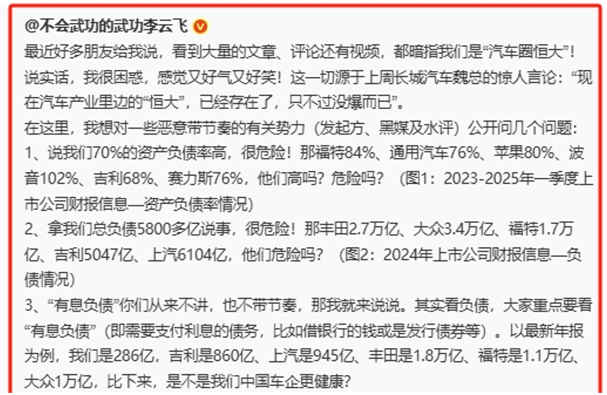 李云飞进一步表示,“整体来看,中国主流车企的资产负债情况要好于国外车企,中国主流车企根本不存在所谓的‘车圈恒大’,任何唱衰中国新能源汽车的言论都是不可取的!”