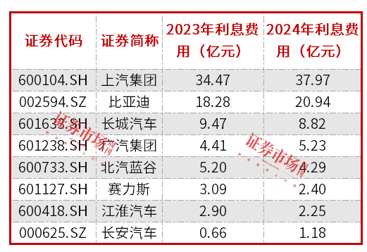 从财务成本角度观察,A股整车企业中,上汽集团的利息费用最高,其2024年利息费用为38亿元,相比2023年的34.5亿元增长了10%;其次是比亚迪,其2024年的利息费用为20.9亿元,同比增长了13%。