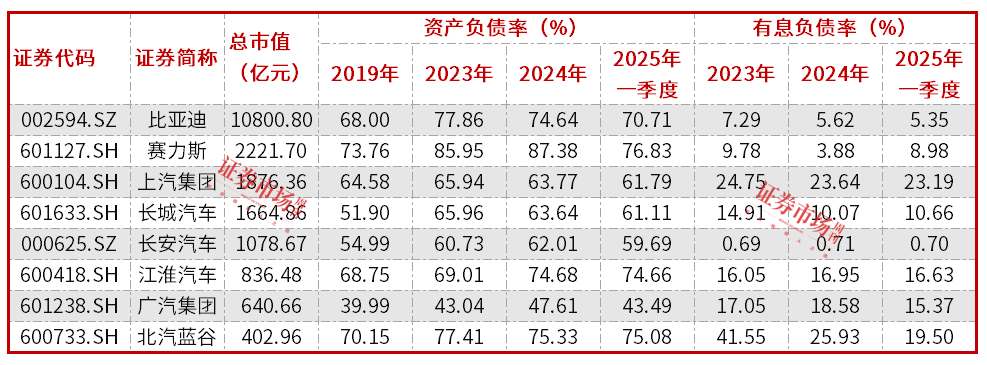 在A股整车上市公司中,资产负债率较高的公司有赛力斯、北汽蓝谷(600733.SH)、江淮汽车(600418.SH),截至2025年3月末,它们的资产负债率分别达到76.83%、75.08%、74.66%。比亚迪、上汽集团、长城汽车、长安汽车分别是70.71%、61.79%、61.11%、59.69%。广汽集团负债率最低,为43.49%。